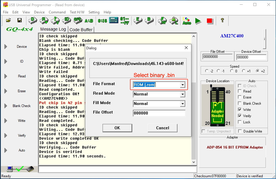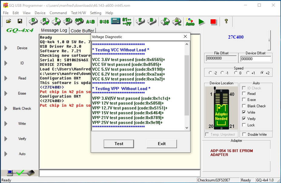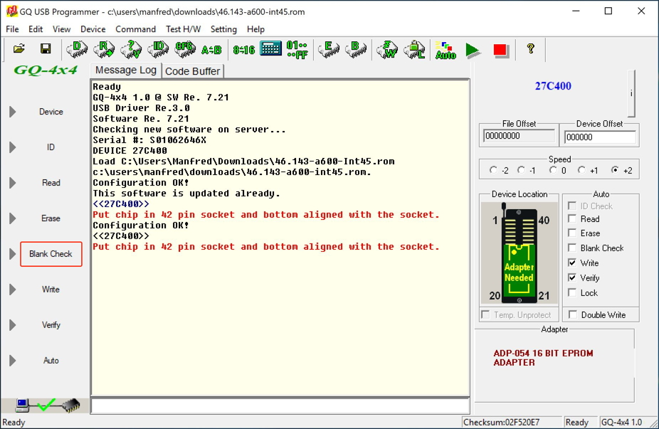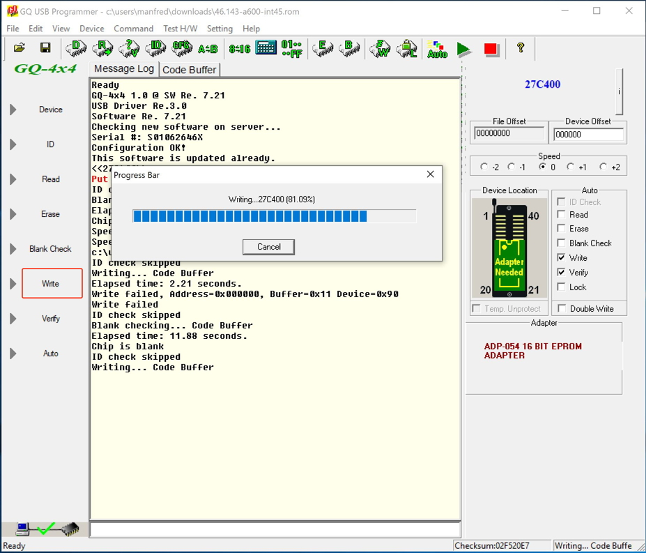 Partly this whole process of writing the ROM was a real pain because the GQ burner would just stop writing at some address. And in fact I had to get the package replaced including the adapter board.